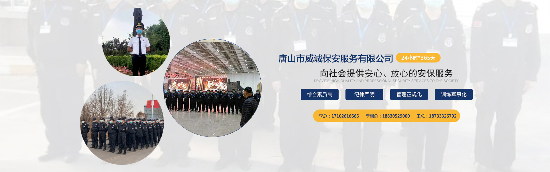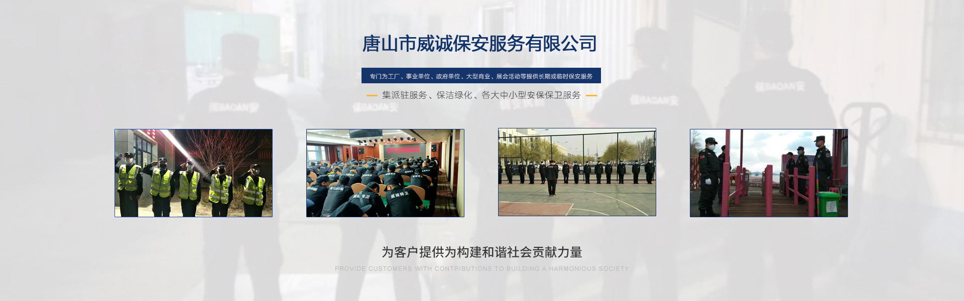 唐山市威誠保安服務有限公司自成立以來以“嚴防死守、忠于業(yè)主”為服務原則,以“客戶滿意、 合作共贏”為根本目標。以科學的管理、多方位多層次的服務,建立了首問責任制,完善了走訪、回訪 、滿意度調(diào)查、末位淘汰的預警管理,不斷提高服務質(zhì)量,提高業(yè)主滿意度,提高企業(yè)形象。秉承“誠 實守信,紀律嚴明,團結(jié)協(xié)作,致精致誠”的服務理念,為客戶提供高品質(zhì)、多方位、專業(yè)化的保安服務。 本公司制定了嚴謹?shù)亩ㄏ蛘猩徢芭嘤枴⒖己虽浻谩徶信嘤枴⒊掷m(xù)培訓、末位淘汰制等一整套完善的管理體系。可以根據(jù)客戶的要求實地勘察評估,以量身定做的方式提供安保防范服務。